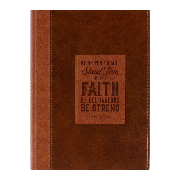 A smooth tawny brown faux leather covers the back of the journal, wraps around the spine, and is joined to a saddle tan front panel with a double row of topstitching.